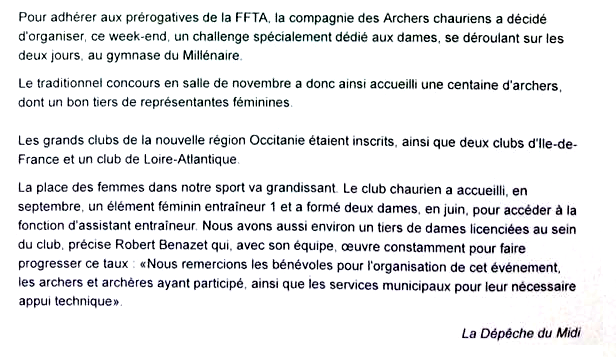 Ce week-end 27 et 28 janvier 2018, le comité départemental de l'Aude de Tir à l'Arc a organisé son championnat annuel salle, avec phases de qualification et duels.